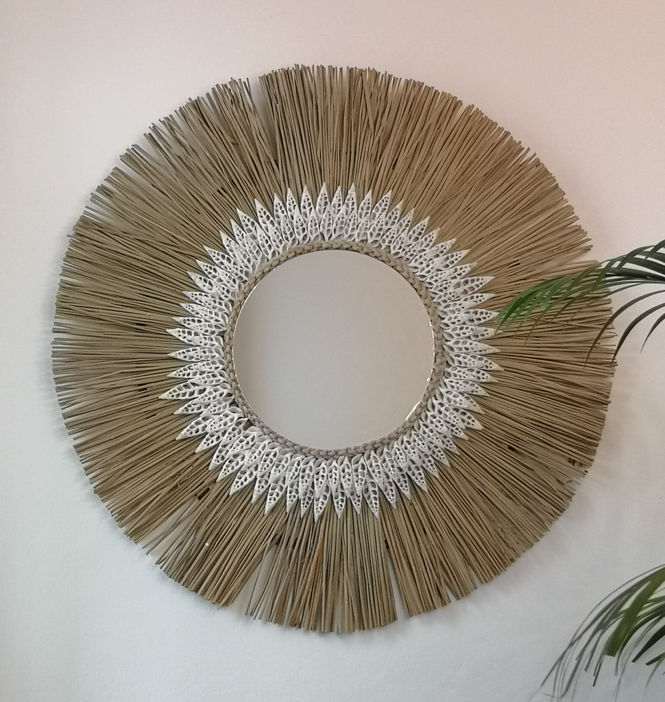Material: Spiegelglas, Alang-Alang Gras, Muscheln, Holz, Baumwolle